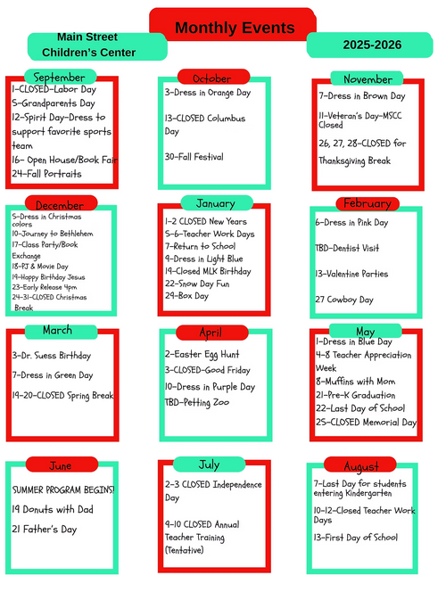 We are a full-time Christian child development center located in the Main Street Baptist Church Historical Building. It’s our purpose to minister to families in our community by providing a safe and nurturing environment where children can learn about God’s love through teaching and example.